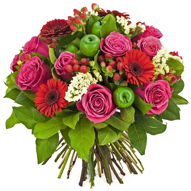 Mały - 5 róż + 5 gerberów + 3 margaretek+ 5 hyperium + 5 jabłek + zieleń dekoracyjna